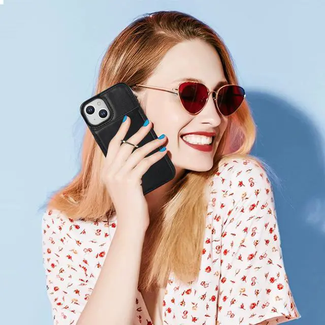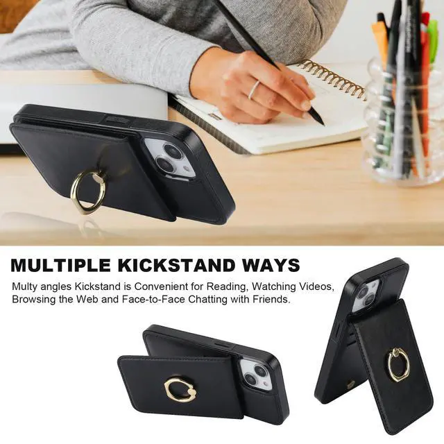 for iPhone 13/14 Case Wallet with Credit Card Holder, 360° Rotation Ring PU Leather Magnetic Clasp Kickstand Heavy Duty Protective Cover for Women and Men 6.1 Inch (Black)