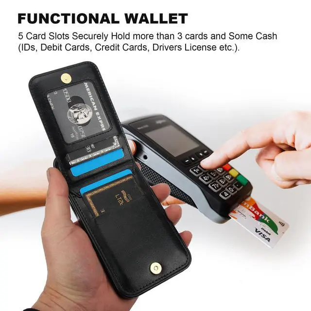 [FUNCTIONAL WALLET]: 4 Card Slots Securely Hold more than 3 cards and Some Cash(IDs, Debit Cards, Credit Cards, Drivers License, etc.) without taking your wallet outside. Magnetic Buttons can keep your case slim and stylish and keep your cash and cards secure.