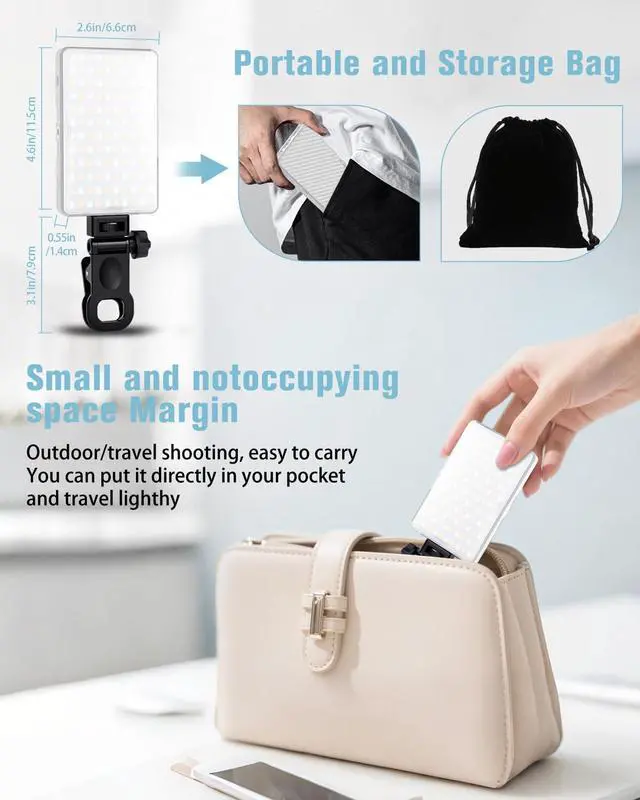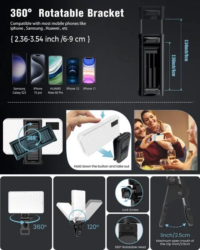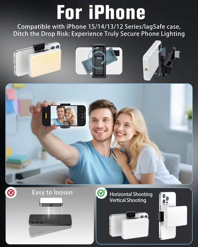 3 Light Modes & 10 Brightness Levels: The selfie light for iphone has 3 light modes(cool light, warm light, cold-warm light). Seamlessly shift 2500K-9000K providing smooth and flicker-free lighting for your selfies and video shoots. 10 adjustable brightness levels, You can adjust its brightness between 10%-100% and choose any brightness you want. Indoors or outdoors, day or night, you can enjoy taking pictures