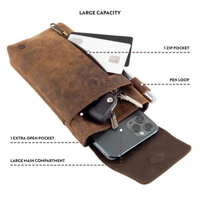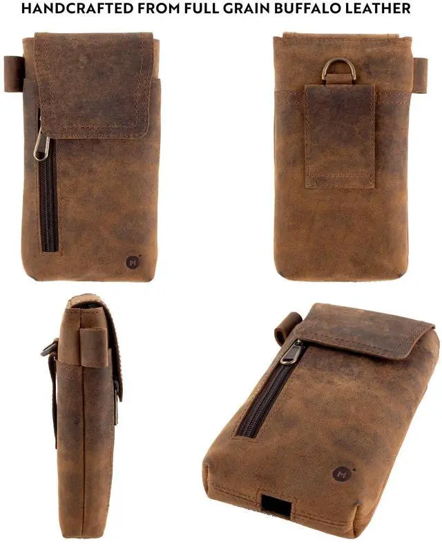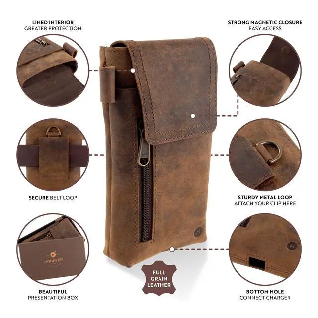 The Moonster Leather Phone Holster offers secure transport, convenient access, and extra storage:
