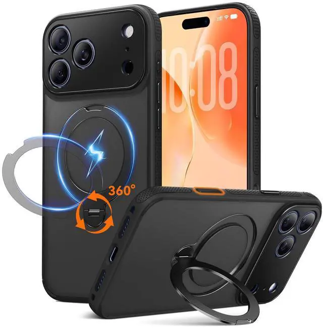 360° Spin Magnetic Stand for iPhone 17 Pro Case, Fit for MagSafe, All Around 4X Military-Grade Protection, Full Camera Protection,Anti-Slip Slim Phone Case for iPhone 17 Pro 6.3", Midnight Black