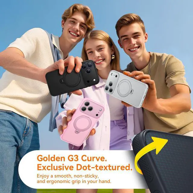 [ & ] Say goodbye to frequently dropping phone. Anti-slip Nano-dot texture offers a secure grip, adds cloud-like softness for endless scrolling. This Ergonomic Golden G3 Curve mirrors your palm's natural shape, while micro-dot grooves ensure a secure, non-sticky grip for iPhone 17 Pro phone case. It's ergonomic science that fights fatigue turning your phone into an extension of your hand, not a burden.