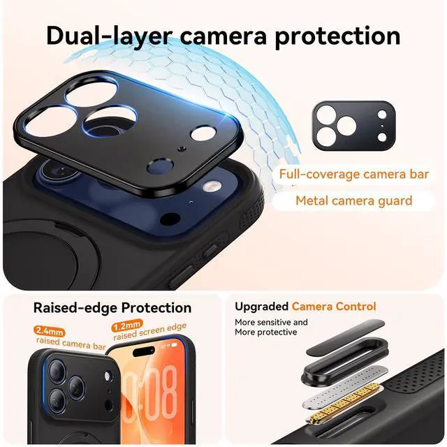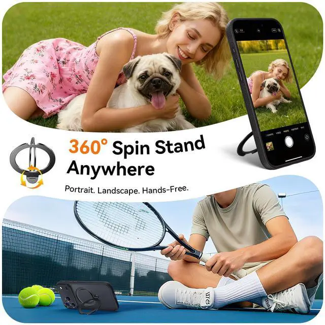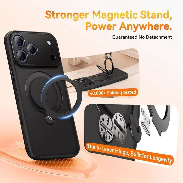 [° |- - ] Flip. Spin. Lock. The shockproof iPhone 17 Pro case with stand clicks into any angle with lab-tested precision. The crisp click sound turns every rotation into a satisfying tactile win even doubles as a stress-relief fidget! With 45,000+ rotation tests, the stand outlasts ordinary cases by 200%.