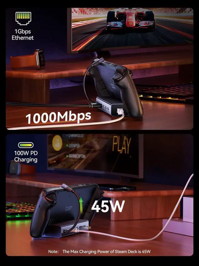 - We recommend that you connect your Power Adapter (45W and above) while docking your Steam Deck to ensure stable operation of the output video and external devices.