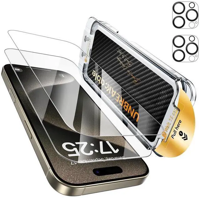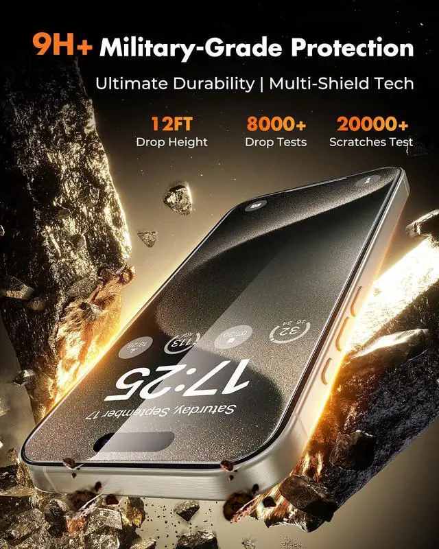 Above 9H Military-Grade HardnessCrafted from aerospace-grade iphone 15 Pro Max tempered glass, this iPhone 15 Pro Max screen protector and camera lens protector set (2+2 pack) is precision heat-treated at 400°C for 4 hours. With above-9H military-grade hardness in a refined 0.33-inch profile, it delivers up to 8× the durability of standard glassengineered to withstand drops, scratches, and daily wear with lasting performance.