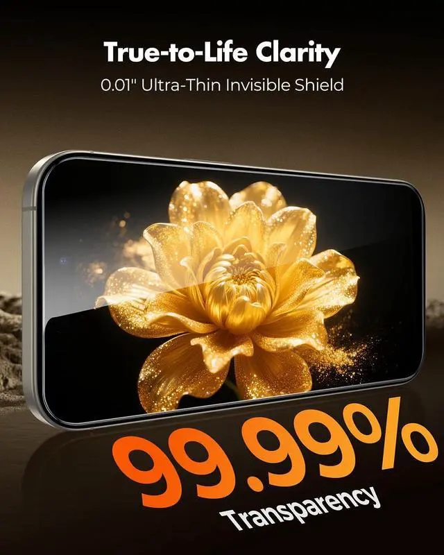 99.99% HD Display ClarityMade with high-aluminosilicate glass, this glass screen protector iphone 15 Pro Max preserves over 99.9% light transmittance to maintain original color accuracy and brightness. Enjoy a crystal-clear viewing experience that looks and feels true to the native display.