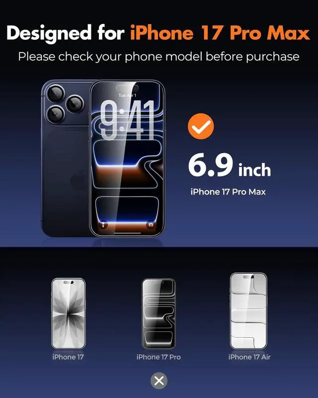 [Military-Grade 9H Tempered Glass Protection] Built with aviation-grade glass and reinforced through a 4-hour, 400°C thermal tempering process, our screen protector delivers outstanding durability and superior scratch resistance to guard your iPhone 17 Pro Max.