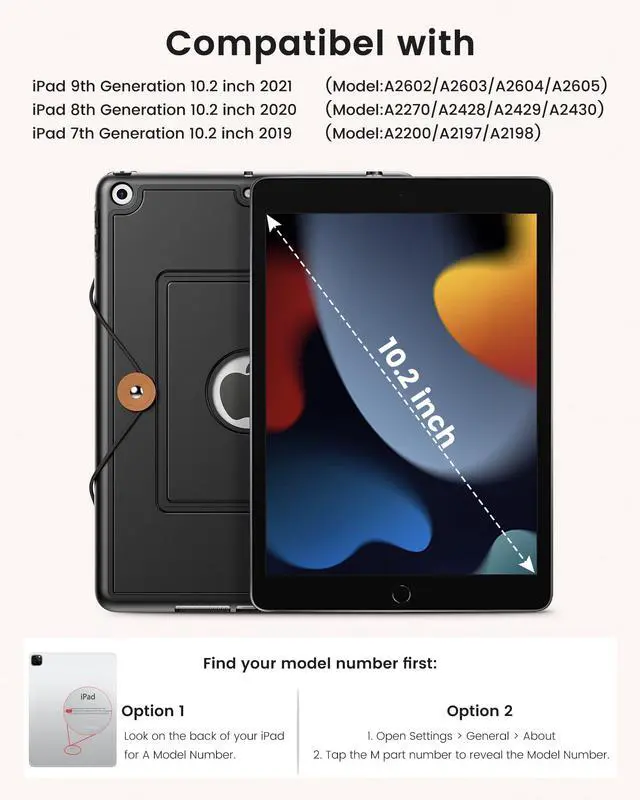 Specifically designed for iPad 10.2 inch:This keyboard case is specifically designed for iPad 10.2 9th Gen 2021 (Model Number: A2602, A2603, A2604, A2605)/8th Gen 2020 (Model Number: A2270, A2428, A2429, A2430)/7th Gen 2019 (Model Number: A2197, A2200, A2198). Not for iPad Pro 10.5 2017/not for iPad Air 3 Gen 10.5 2019 and other models.Please make sure your tablet model is correct before purchasing