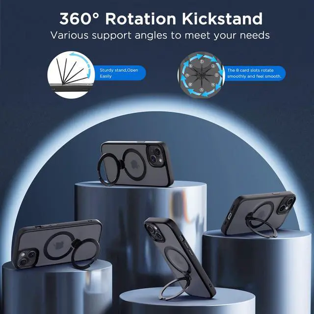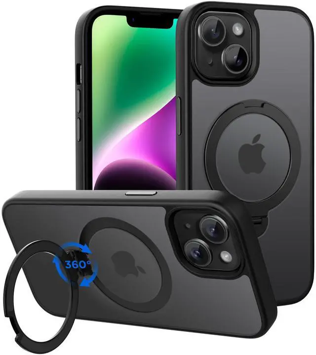 Newly Upgraded 360° Rotating StandThe fixed base of CACOE case for iPhone 13/14 adopts the upgraded technology of injection molding wrapped one-piece molding, which is more stable than riveted base, and can withstand 15kg pulling force, so that the stand is not easy to loosen and fall off in the process of using. It is firmly embedded in the back panel of the case and durable in opening and closing tens of thousands of times.