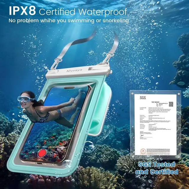 SGS Certified and IPX8 Waterproof Rating-100ft/30m IPX8 certified professional floating waterproof phone bag is perfect for swimming pools, beaches, kayaking, fishing, surfing, sailing, skiing, boating, snorkeling, tubing, rafting, showers, saunas, water parks in Hawaii, the Caribbean and more, and also for storing your ID and cell phone, 100% waterproof, one of the best cruise, vacation and travel essentials/accessories!