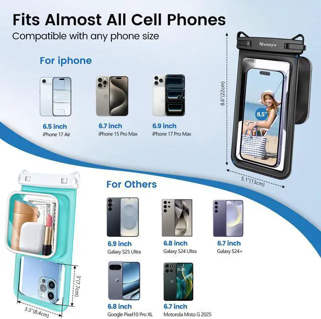 Fits Most Cell Phones-The water proof phone pouch iphone measures 8.5 inches and fits most cell phones with or without a case, providing double insurance for your phone. Fits large devices up to 7.5 inches, such as iPhone 17 16 15 14 13 12 11 XS XR X Pro Max Plus Mini, S26 25 24 S23 Ultra and more.