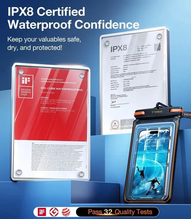 INTERNATIONAL CERTIFICATION, SAFETY PROTECTION: This waterproof phone case exceeds the IPX8 certification standard, it can withstand immersion in water up to 100FT more than 30h without any leakage. Resistant to corrosive substances like detergents and sea water, offering long-lasting protection. Plus, it has won three major design awards in 2023 including RedDot, iF, and Good Design, which adds beauty and confidence to your experience