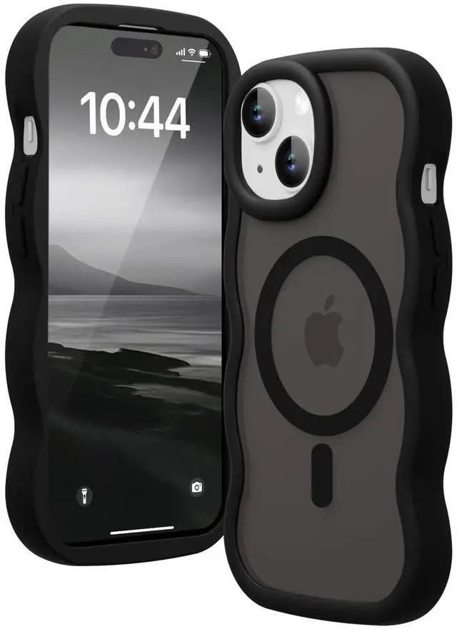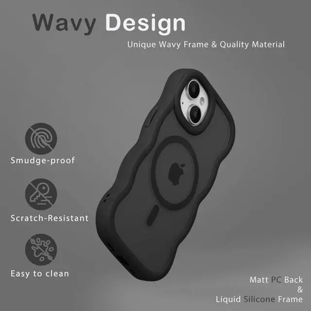 Magnetic for iPhone 13 Case, for iPhone 14 Case, Compatible with Magsafe Wavy Frame Cute Translucent Matte Hard Back Silicone Bumper Shockproof Protective Phone Case Women Girls, Black