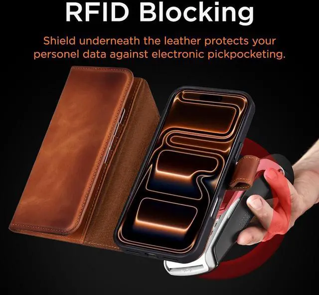 ENHANCED PROTECTION: This iPhone 17 Pro leather case offers coverage for all corners and delivers robust safeguarding to your cellphone. Its durable soft inner case envelops the entire body featuring a cushioned shockproof edge to shield your phone from accidental drops and impacts. This iPhone 17 leather wallet case comes with RFID protection against potential data theft. Safeguard your essentials with confidence using our leather wallet case embedded with RFID Blocking shield.
