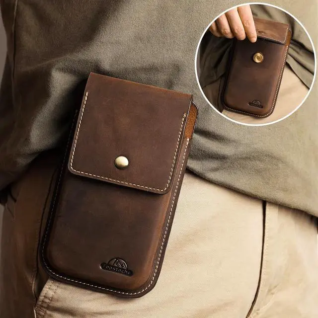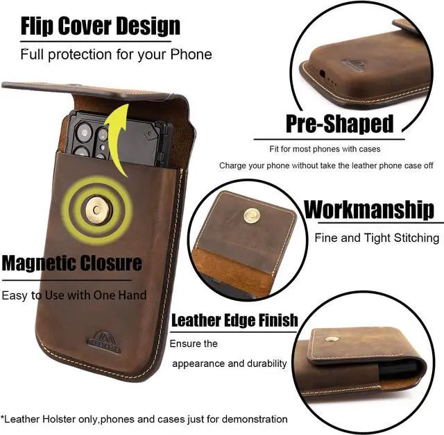 A strong magnetic closure keeps the flip cover closed providing security and holding your phone firmly in place.? Premium Material- Made of natural leather for long-lasting use. All-around leather protection completely wraps around your phone protecting it from dust to prevent screen scratches and daily wear and tear. The pre-shaped design that provides more space and the reinforced stitching makes the cell phone holster with belt clip more robust and long-lasting.? Convenient to Use- Hole design at the bottom of the phone holster allows you to easily access the charging port to charge your phone without removing the leather phone case.