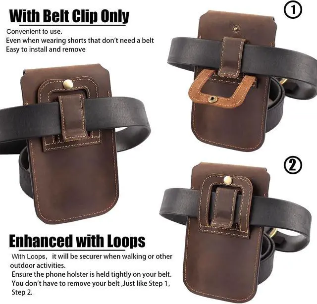 Allows you to effortlessly lift the flip cover with one hand while your phone is in the leather belt pouch and then take your phone out of the cell phone case or put it back in for easy access to your daily calls.? Easy to Carry- The back of the cell phone belt holder for men includes a metal belt clip and belt loops with buckle. The push-on button belt loop can be worn on most belts while not requiring you to take off your belt. A belt clip can be clipped directly to your belt pants backpack straps etc.