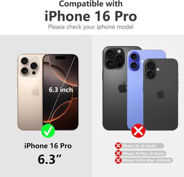 Note: Wireless charging can only be done after disassembling the card wallet )Compatibility: Compatible with iPhone 16 Pro ( 6.3 inches) phone. Before purchasing please check your phone model (Settings - General - About - Model Name) to ensure that the product you are purchasing is compatible with your phone modelSuper