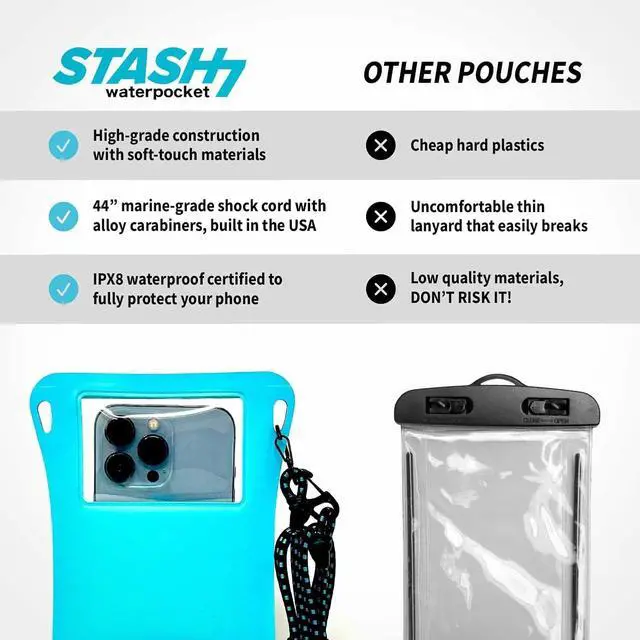 CERTIFIED IPX-8 WATERPROOF CELL PHONE POUCH: the Stash7 Waterpocket waterproof pouch has an IPX-8 waterproof certification by the worlds leading testing & verification company, meaning that it' s fully submersible and safe to take on every water-filled adventure. This is not your typical cheap phone case. The Stash7 Waterproof Phone Cases soft yet ultra durable construction and high grade materials are built to last and travel this big amazing world
