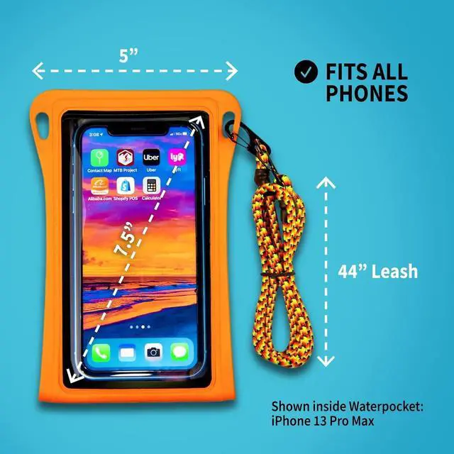 ALL Apple iPhones: 14 Pro Max, 14 Pro, 14, 13 PRO MAX, 13 PRO, 13, 12 PRO MAX, 8, + etc. Samsung Galaxy S22 Ultra, A53, A13, A23, S10 +, etc. Great for the beach and other recreational water adventures. Most users will even be able to keep an average sized protective cover on their phone while using the Waterpocket.