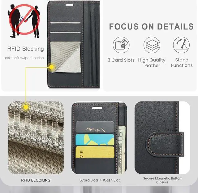 [RFID Shielding Technology&Luxury Kickstand Function] The wallet case is equipped with RFID shielding technology designed to protect your card information from identity theft. With an innovative blocking material, it will make you feel safe wherever you are. The folding line on the back of case allows you to convert the wallet case into a kickstand. The fold book style phone case offers you a comfortable and satisfying visual experience.