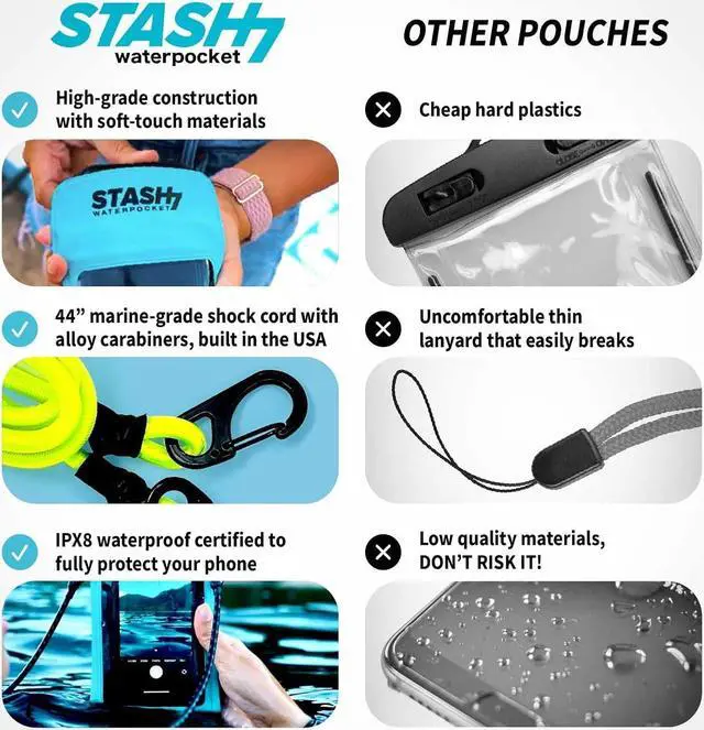 CERTIFIED IPX-8 WATERPROOF CELL PHONE POUCH: the Stash Waterpocket waterproof pouch has an IPX-8 waterproof certification by the worlds leading testing & verification company, meaning that it' s fully submersible and safe to take on every water-filled adventure. This is not your typical cheap phone case. The Stash7 Waterproof Phone Cases soft yet ultra durable construction and high grade materials are built to last and travel this big amazing world