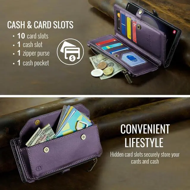 Multi-functional wallet case for Samsung A15 5G: This leather case for Galaxy A15 doubles as a wallet with 10 card slots, a zipped coin pocket and a cash pocket; You can keep your ID, credit cards, notes and coins all in one convenient place, effortlessly combining fashion and functionality