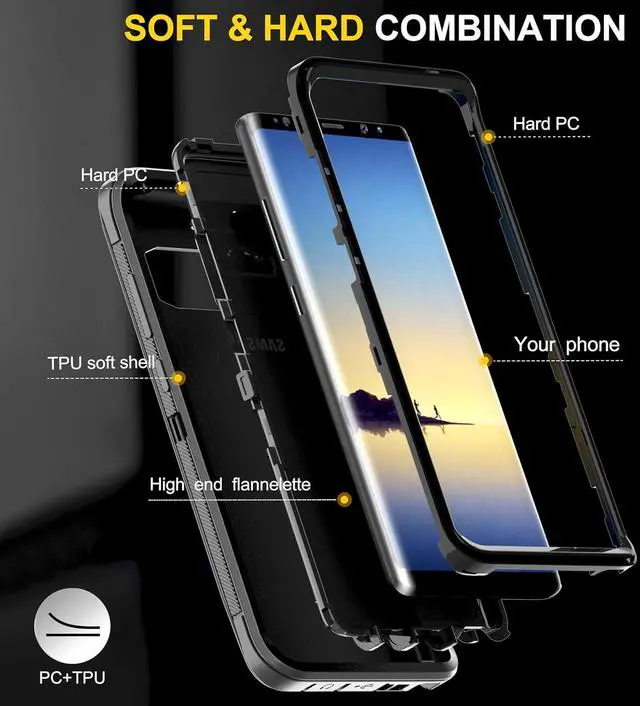 perfect fit: the galaxy note 8 case has a screen frame that is 2mm higher than the screen and a camera frame that is 5mm higher. the charging port comes with a dust cover, which perfectly shields the dust and keeps the charging port clean. all ports of this phone case are precisely measured, precisely cut and easy to access. tips: you can watch the installation and disassembly steps in the video!