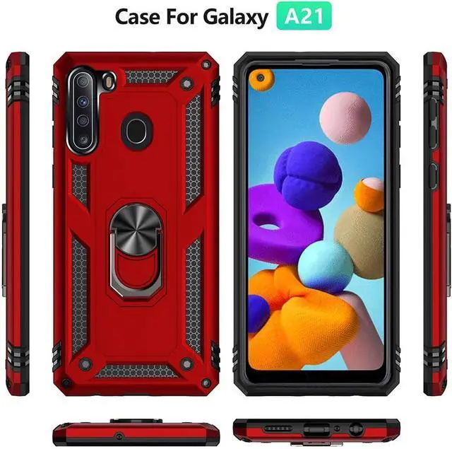 for Galaxy A21 Case, with HD Screen Protector, [Military Grade] Ring Car Mount Kickstand Hybrid Hard PC Soft TPU Shockproof Protective Case for Samsung Galaxy A21 (Red)
