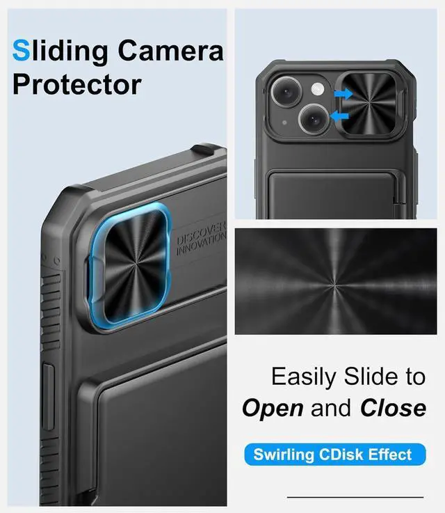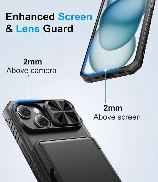 Notice: Not Compatible with Wireless Charging? Keep Your Cards Handy in Safe RFID Protection. Slim Down Your Pocket! Our iPhone 15 wallet case is built in a card holder that can securely store about 4-5 cards according to the thickness (ID/credit cards/etc. ) or a few sheets of cash to replace your bulky wallets for convenience when going out in daily life. Moreover we have embedded the RFID blocking protection in the card holder to protect against data theft by RFID scanners. Extraordinarily convenient and secure for your travel? Slide it! Protect What's Important! Slide Camera CoverInnovative design with sliding camera protector and 2mm raised lips around the camera the BXYJY iPhone 15 case with card holder provides full protection for the back lens to avoid scratches and drops. No more worries about damaging the camera lens and protect your privacy? No Fear of Drops! Upgrade Rugged Military Grade Drop ProtectionMade of a matte PC hard back and soft TPU bumper This BXYJY i Phone 15 case with camera cover is also equipped with an upgraded shock-absorbing airbag on every corner 2mm raised edged protection for screen and camera and inside microfiber lining to withstand shock and drop inside whose total structure highlights the best shock solution of the case to prevent the unexpected drops scratches and impact? Precise Cutout Floating Button and Eyelet for StrapThis BXYJY premium phone case for iPhone 15 is cut out precisely for easy access to all the functions of your phone and fits snugly to protect the exterior parts.