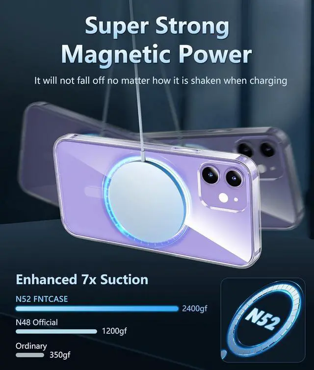 Strong Magnetic AttractionCompatible for Magnetic chargers and other Qi Wireless chargers without signal influence. The iPhone 12 magnetic case has built-in 38 super N52 magnets. Its magnetic attraction reaches 2400 gf which is almost 7X stronger than ordinary therefore it won't fall off no matter how it shakes when you are chargingCrystal Clear & Never YellowUsing high-grade Bayer's ultra-clear TPU and PC material allowing you to admire the original sublime beauty for iPhone 12 while won't get oily when used. The Nano antioxidant layer effectively resists stains and sweat keeping the case clear like a diamond longer than others10FT Military Grade ProtectionPassed Military Drop Tested up to 10 FT.