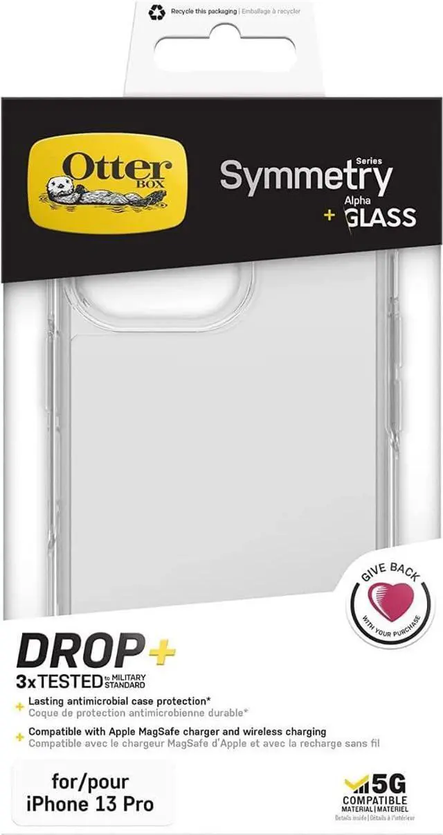The ultra-slim Symmetry Clear Series; iPhone 13 Pro case undergoes thousands of hours of drop testing to ensure your smartphone gets the utmost protectionProtect your smartphone with ultra-slim Symmetry Clear series the iPhone 13 Pro transparent case that's easy to install and has 3 times as many drops as military standard ( MIL-STD-810G 516.6 ); OtterBox Symmetry case has raised edges to protect your smartphone's camera and screen from serious drops and scrapes; Clear case shows off your phone's elegant design while protecting against drops; dings and scratchesLasting antimicrobial technology that helps protect case exterior against many common bacteriaMade from 50 Percent recycled plastic; OtterBox Symmetry Clear Series provides flawless; sleek and stylish protection from scratches and cracksIncludes crystal-clear Alpha Glass Screen Protector is an ultra-thin tempered glass made with fortified material technology to withstand drops breaks scratches and daily wear.