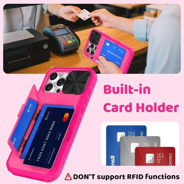 (Note: DON'T support wireless charging & RFID functions)Built-In Wallet with Card StorageNever worry about carrying a separate wallet again! This iPhone 16 Pro case features a hidden back compartment that securely holds up to 2 cards (credit cards IDs or cash). The Buckle closure ensures your cards stay in place while allowing quick access whenever needed. Built-in Makeup MirrorDesigned with busy women in mind this case includes a sleek high-quality mirror discreetly embedded in the back panel. Whether you're freshening up your makeup checking your appearance or fixing your lipstick the mirror provides instant convenience without the need to dig through your bag. Slide Camera Cover for Ultimate Lens Protection Keep your iPhone 16 Pros advanced camera system safe from scratches dust and fingerprints with the innovative sliding lens cover. Simply slide the cover open when taking photos and close it afterward for full protection. The smooth mechanism ensures effortless operation while preserving your cameras clarity. Convertible Stand for Hands-Free ViewingNeed to watch videos make video calls or follow recipes? The back panel fully opens and folds into a stable stand offering the perfect viewing angle for media FaceTime or even selfies.