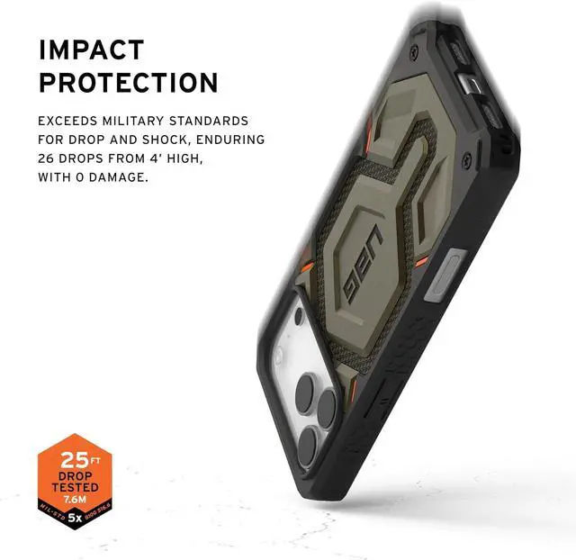 Multi-layer Protection: Handcrafted with premium materials featuring a feather-light construction with 5 layers of protection staring UAG's signature armor frame shock-resistant core layered with DuPont Kevlar Material a polycarbonate shear plate alloy metal hardware and impact-resistant rubber surround.