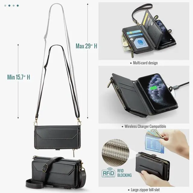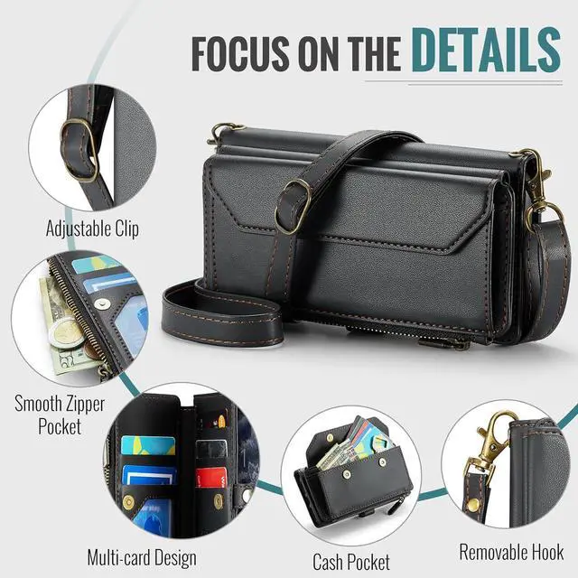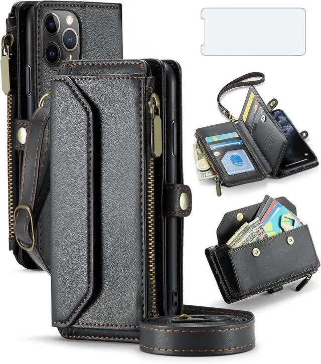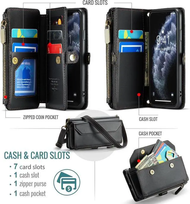 Package includes: We will send the phone case with 1 piece tempered glass screen protector + 1 detachable wrist strap + 1 detachable crossbody strap. You can adjust it to your preferred length the crossbody strap can be taken off if you just need the case. Card Slots & Cash