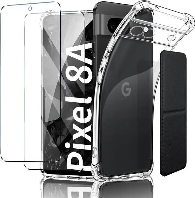 Value Pack: Clear Slim & Functional** Complete bundle: **Transparent anti-yellowing TPU case** ( 1.2 mm thin) + **2x glass screen protectors** + **leather kickstand**. Shows off your Galaxy Google Pixel 8As design while enhancing grip and heat dissipation.