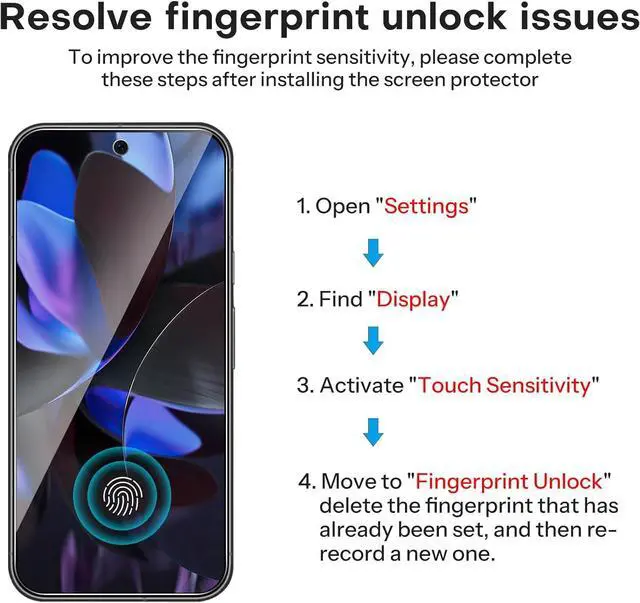 Attention to Fingerprint! After installing your pixel 9 pro xl screen protector please redo your fingerprints again and delete the previously registered fingerprints then turn on the touch sensitivity to improve the sensitivity for your screen (you can search the touch sensitivity in settings and open the adaptive touch and screen protector mode )