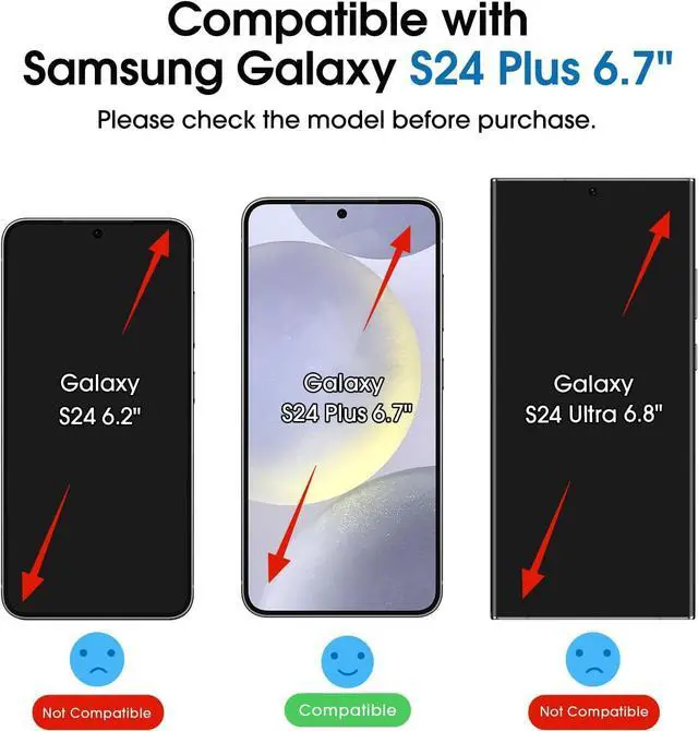 Auto-alignment within 30 Seconds! Say goodbye to manual misalignment the Galaxy S24 Plus 6.7 screen protector is embedded in a plastic frame that fits perfectly over your phone. Set the frame on your phone swipe down the middle and done! Perfect installation within 30 seconds! Watch our Installation Video to see how easy it is to use our Innovative OneTouch Auto-Alignment Screen Protector. Only Compatible with Galaxy S24 Plus 6.7 Specially designed ONLY for the Galaxy S24 Plus Screen Protector 6.7. Please check your phone model before buying this tempered glass screen protector.