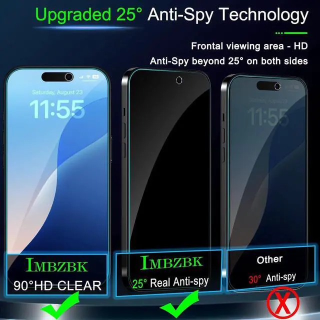 True 25° Privacy Protection: Most privacy protector on the market only gives 30° viewing IMBZBK's Privacy Coatings made of new materials from Germany with Microlourver Optical Technology It offers optimum 25° degree peep (Smaller viewing angles mean stronger privacy protection). The screen is only visible to persons directly in front of the screen maximum protection For your privacy & sensitive information even your friends or colleagues sitting next to you also can't see on your messages.