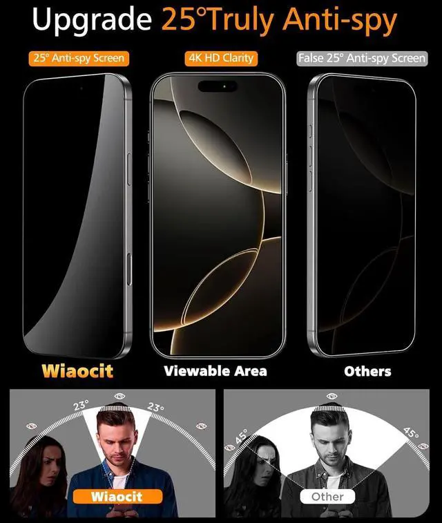 Frontal 8K High Transparency: Wiaocit for iPhone 16 Pro Max Privacy screen protector breaking through the defects of the blurred dark dizzy picture of the privacy glass films making the front view ultra clear truly restoring the natural color reproduction and view of iPhone 16 Pro Max screen. Even in the sunlight you still can see the screen clearly.