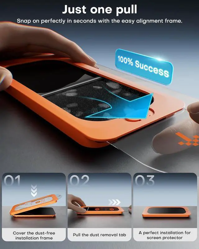 Simple Application: Experience the easiest installation process ever designed for a screen protector. Simply position the alignment frame on your iPhone 17 Pro Max gently pull the plastic tab and watch as the high-quality glass seamlessly settles onto your display. No complicated steps no messy adhesives and no frustration. Its installation made foolproofso simple youll hardly believe its doneMilitary-Grade