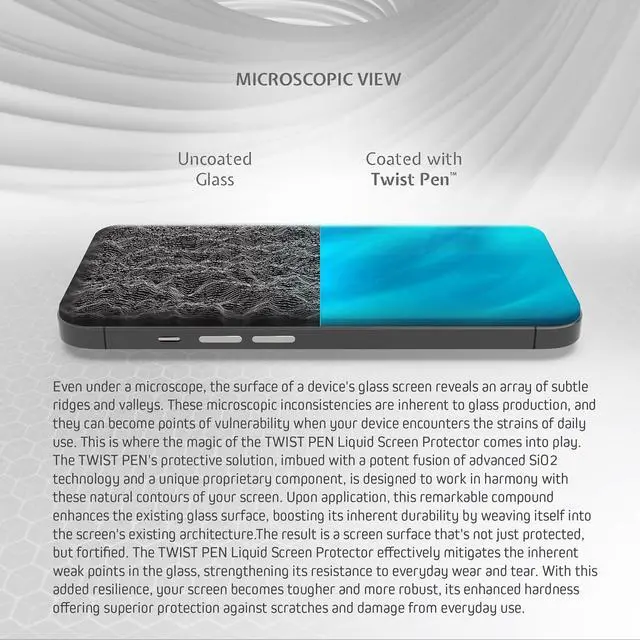 Revolutionary Protection: The TWIST PEN Liquid Screen Protector leverages advanced SiO2 technology and a unique proprietary component providing a robust shield that significantly enhances the strength and scratch resistance of your device's screen. Compatible with all mobile devices including foldable phones and curved screens.