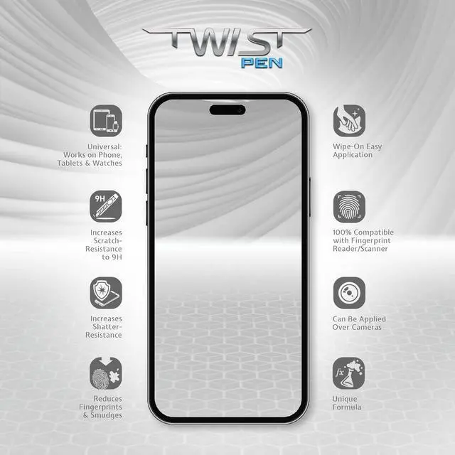 Innovative Design: Patented TWIST PEN design redefines the application process making it as simple as twist glide and protect. TWIST PEN ensures a smooth perfectly even application resulting in a microscopic nearly invisible shield that adheres seamlessly to your screen.