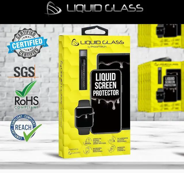 ProofTech Liquid Glass is a cutting-edge super durable completely transparent liquid screen protector that bonds to the glass of your device offering greatly enhanced impact and shatter resistance. Creates an invisible protective coating that increases the devices screen to 9H hardness level. Made of silica dioxide (Si02) which is essentially microscopic particles of glass suspended in a liquid solution. Fills in the imperfections of the screen and adds an additional layer of glass (should not be used to repair broken screens. Does not fix existing scratches or damages). Easy bubble free application with a universal fit; ideal for curved screens and tablets.