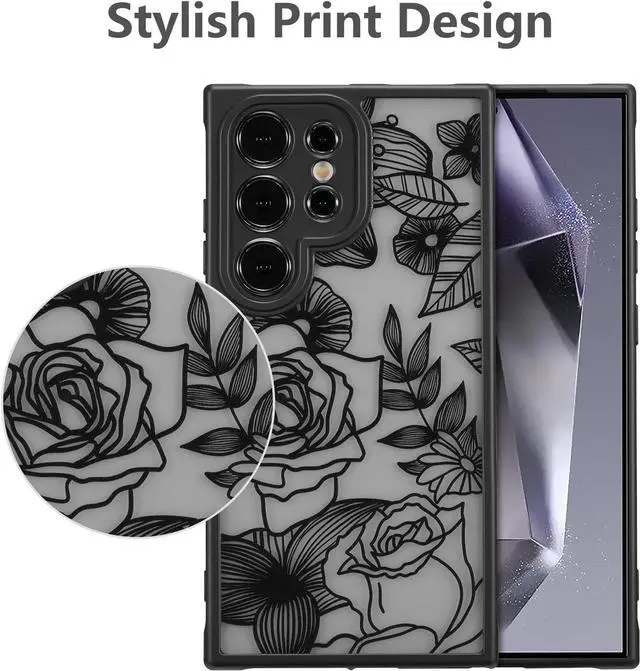 New Upgraded DesignBlack floral phone case with black buttons integrated design more not easy to fall off more cool. The unique black rose flowers pattern design makes your phone more attractiveCamera & Screen ProtectionThis for S24 Ultra case with raised edges around screen & camera lens has enhanced shock & scratch protection to effectively absorb impact and protect your phonePremium MaterialThis for S24 Ultra phone case is made of premium TPU material comfortable touch thin and sturdy translucent matte frosted cover not yellowing anti-scratch. Support wireless chargingSlim & Precise CutoutsThis for Galaxy S24 Ultra Case is thin and lightweight easy to install or remove easy to fit in your pocket perfect for everyday use.