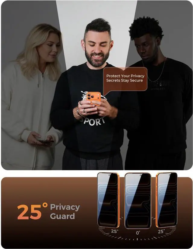Dust Removal Tech: Our innovative auto-dust-removal technology ensures a clean application every time. The private screen protector iPhone 17 Pro Max repels dust particles making installation hassle-free and leaving your screen pristine25° Privacy Protection25° Viewing Angle for Enhanced Privacy. Equipped with advanced 25° anti-peep technology this iPhone 17 Pro Max privacy screen protector ensures that your screen content is only visible within a 25° viewing angle. This effectively prevents others from seeing your screen content when viewed from the side providing superior privacy protection for your personal and sensitive informationAnti-Fingerprint & Enhanced DurabilityThe screen protector features an anti-fingerprint coating that minimizes smudges and fingerprints keeping your iPhone 17 Pro Max looking clean and new. Made from high-quality tempered glass it offers superior durability and scratch resistanceExclusive Fit for iPhone 17