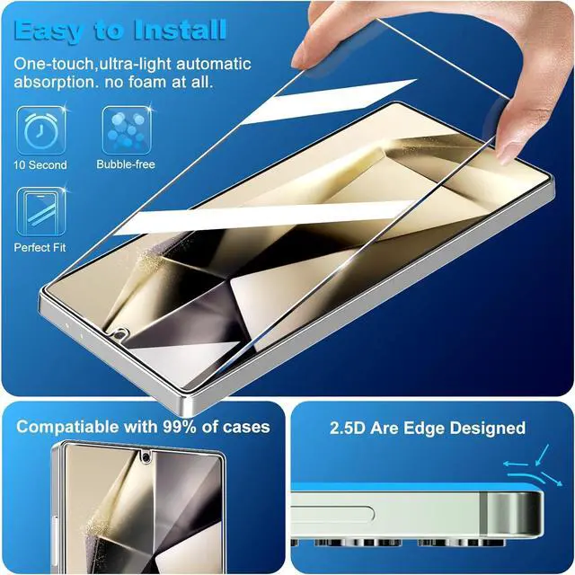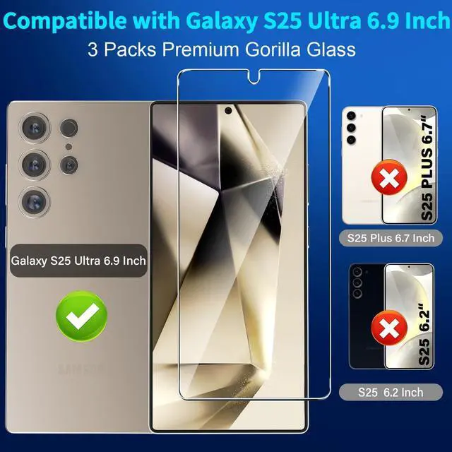 Support Ultrasonic Fingerprint Face ID S Pen & Compatible ModelOnly Compatible with Galaxy S25 Ultra 6.9 inch 2025 Not for any other models. The Ultra-Thin Screen Protector - 0.01 s Unlock Speed Highly Responsive Touch Technology Supports S Pen Face ID Compatible No More Unresponsive Unlocking Defects9H hardness& 3X Stronger Scratch resistantUpgrade 10X Military Shockproof with edge strengthening design Highly durable Resistant Tempered Glass can Effectively Protect Your Galaxy S25 Ultra from Unwanted Scuffs and Scratches by Keys and Some Other Hard Substances. 3 Pack Screen Protectors are both made of High-quality Tempered Glass for Galaxy S25 Ultra ( 6.9 )Case Friendly & Maximum coverage & Does not fall offIt is 100% brand new Precise laser cut Full Glue Sticky tempered glass and will not fall off exquisitely polished 2.5D rounded edges technique makes curved edges of the film to perfectly fit curved corners and edges of the phone 1.4 mm margin around the edge of the device to be compatible with MOST casesUltra Clear & Touch Sensitivity High-response Haptic Touch Technology gives a True Touch feel 0.18 mm thickness is reliable and resilient which support ultrasonic fingerprint.