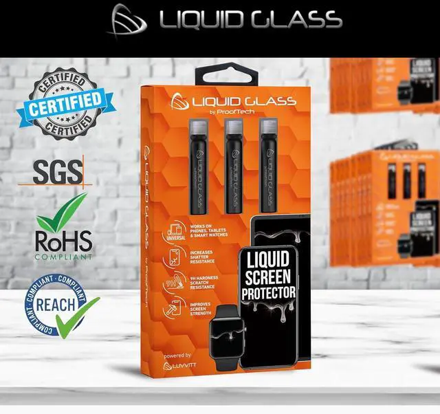 ProofTech Liquid Glass is a cutting-edge super durable completely transparent liquid screen protector that bonds to the glass of your device offering greatly enhanced impact and shatter resistance. Creates an invisible protective coating that increases the devices screen to 9H hardness level. Made of silica dioxide (Si02) which is essentially microscopic particles of glass suspended in a liquid solution. Fills in the imperfections of the screen and adds an additional layer of glass (should not be used to repair broken screens. Does not fix existing scratches or damages). Easy bubble free application with a universal fit; ideal for curved screens and tablets.