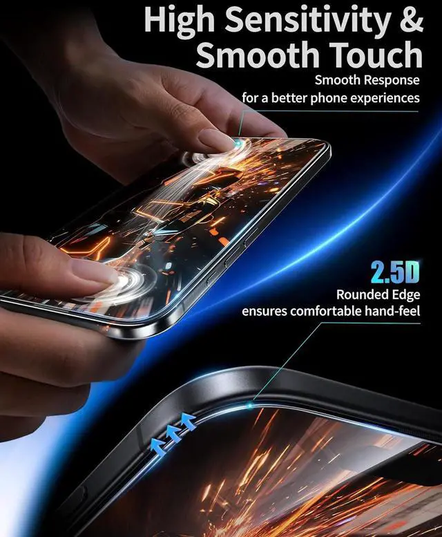 Auto-dust removal use static electricity to pull dust away from the screen minimizing the possibility of air bubblesHigh Sensitivity & Oleophobic Coating - The thickness of the iPhone17 screen protector is approximately 0.33 mm which is ultra-thin. Smooth touch and high sensitivity for seamless typing and gaming. The oleophobic coating to anti-fingerprints smudges and oils resistant keeping your screen clean and clear