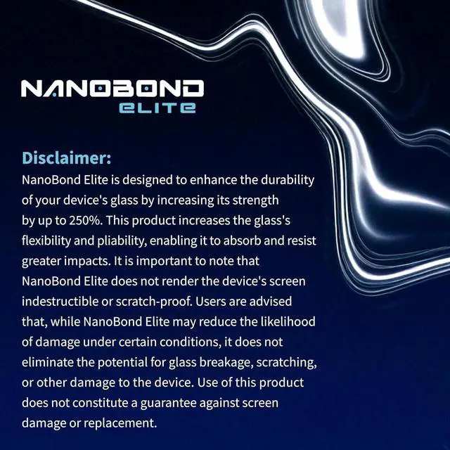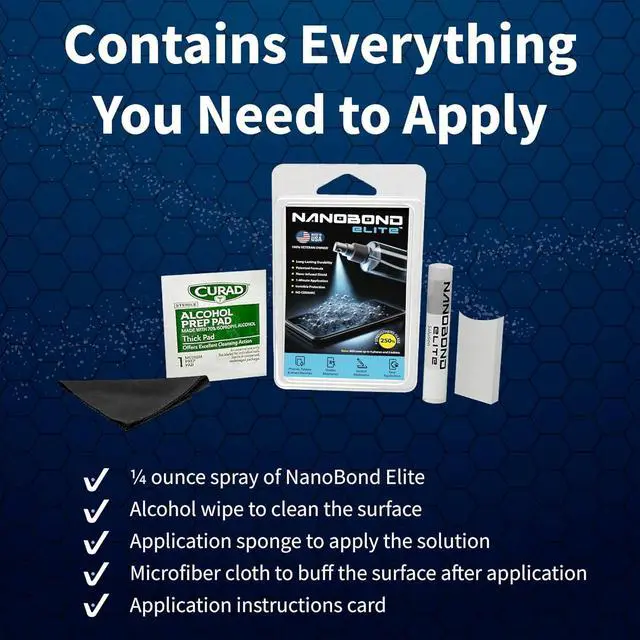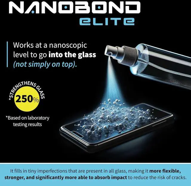 Ultimate Screen Protection Made in the USA Veteran Owned-NanoBond Elite uses a patented formula to create an invisible nano-infused shield that strengthens glass by up to 250% providing maximum protection against shattering and scratches. Easy 1-Minute Application Enjoy hassle-free application in just 1 minute. Simply clean spray rub and buff to create a smooth durable layer of protection for your device. Long-Lasting Durability Designed for long-lasting performance this protective coating is engineered to maintain your devices flexibility while absorbing and resisting impacts. Compatible with Multiple Devices One bottle covers up to 3 phones and 2 tablets.