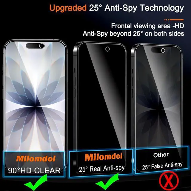 Protection: Milomdoi's privacy coatings made of new materials from germany have better Privacy performance than other materials. This pioneering protector offers an ultra-narrow 25° privacy angle (Smaller viewing angles mean stronger privacy protection). In any setting onlookers will see nothing but a deep black screen. Keeps your personal private and sensitive information hidden from strangers provides the most powerful privacy protection. Full Covers the iPhone's